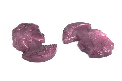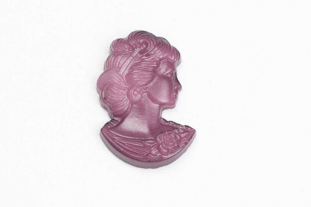 12mm x 7.94mm right facing detailed profile of a woman with coiffed hair and rose on her neckline.