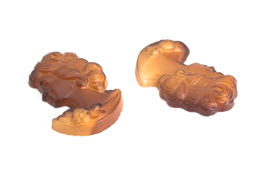 11.93mm x 7.86mm left facing detailed profile of a woman with coiffed hair and rose on her neckline.