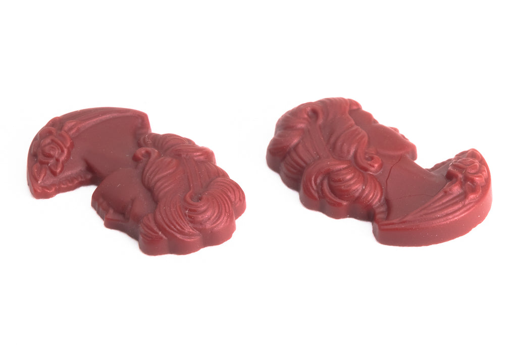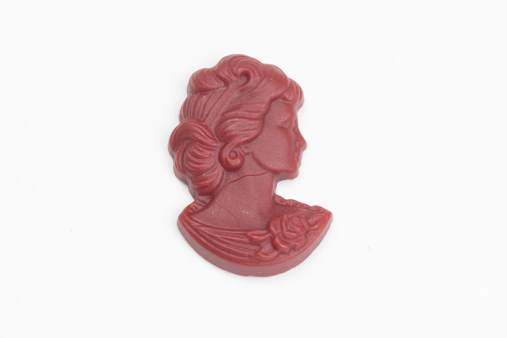 11.74mm x 7.74mm right facing detailed profile of a woman with coiffed hair and rose on her neckline.
