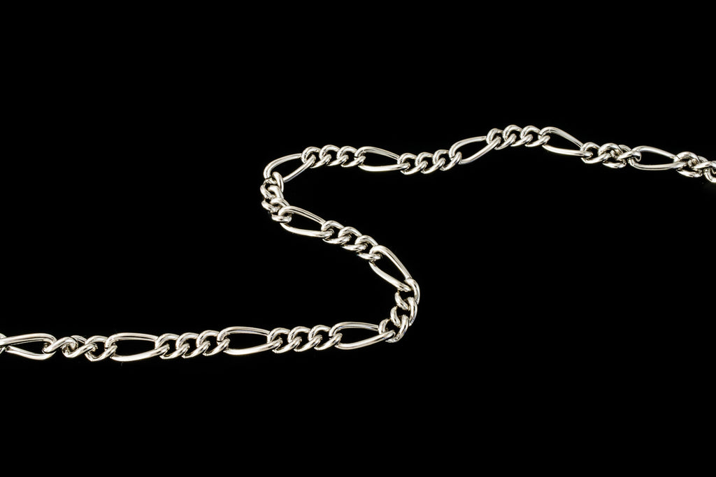 Light, strong, lustrous and non-magnetic.Figaro chain with 5.8mm x 10mm and 5.8mm x 5mm links.Sold by the inch, 5 feet or 10 feet.