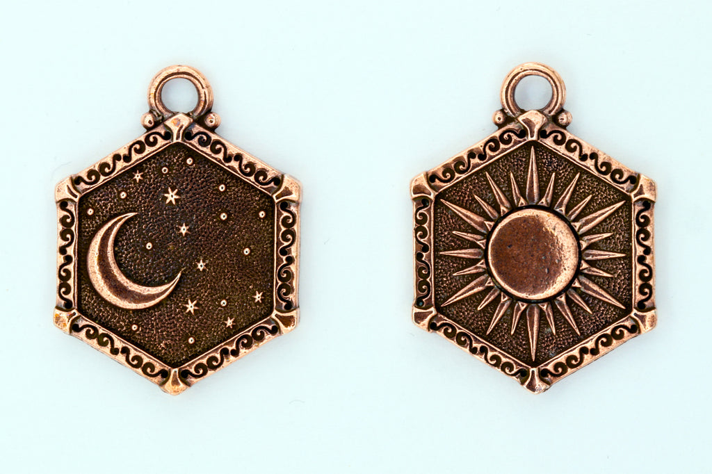 28.5mm x 14.75mm double sided hexagon pendant. On side features a crescent moon and stars, the other a radiant sun.