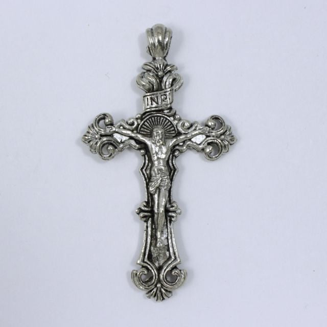 32mm x 60mm antique silver elaborate pewter crucifix with detail on one side.