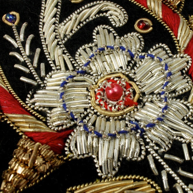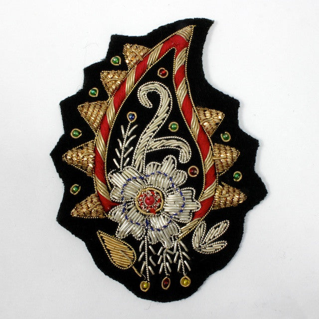 Vintage 1980s 5" x 3" black paisley with red, gold and silver hand embroidery.