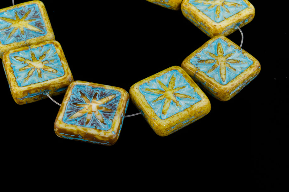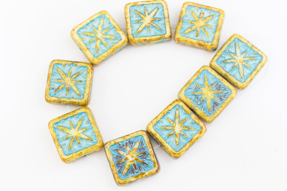15mm opaque beige flat square bead with compass detail and turquoise Picasso finish.