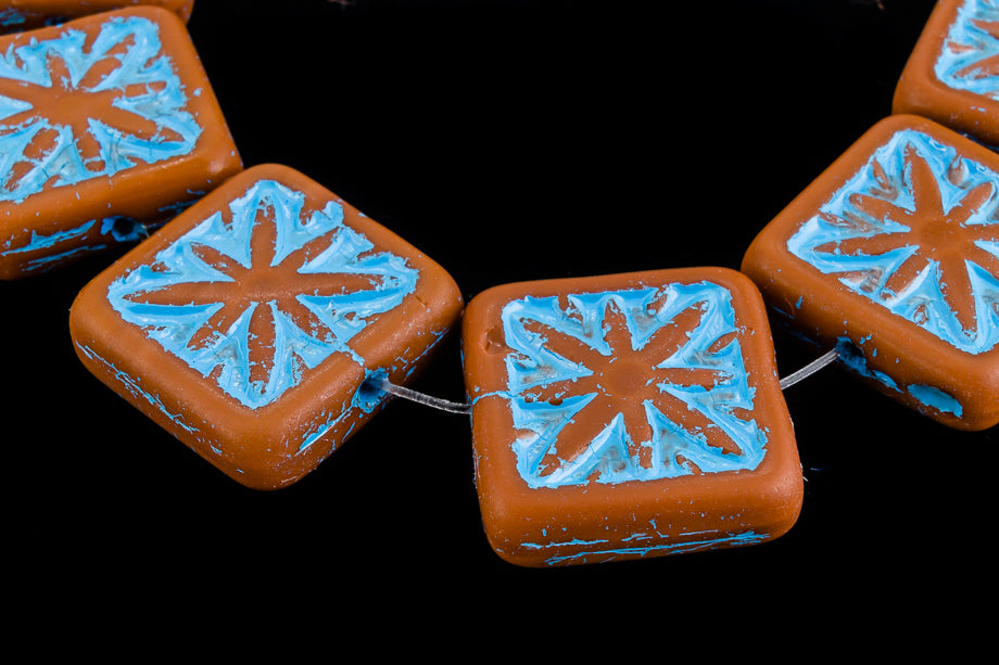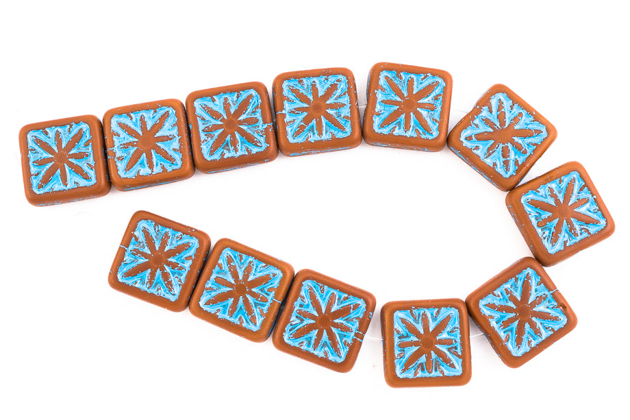 15mm matte opaque coffee flat square bead with turquoise compass detail.