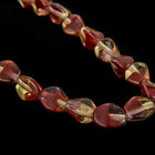 Opaque dark red swirled with transparent light topaz.