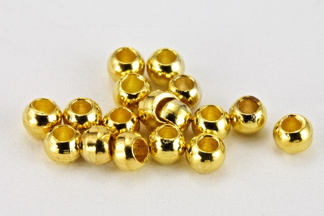 Plated brass mini gold tone round crimp bead. Fits 1mm cord.