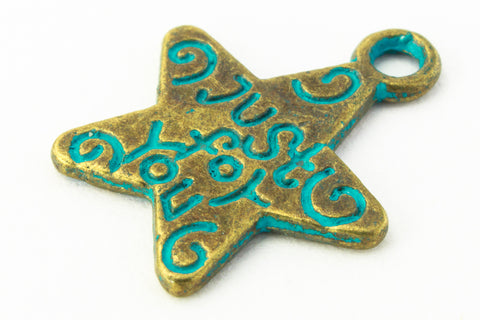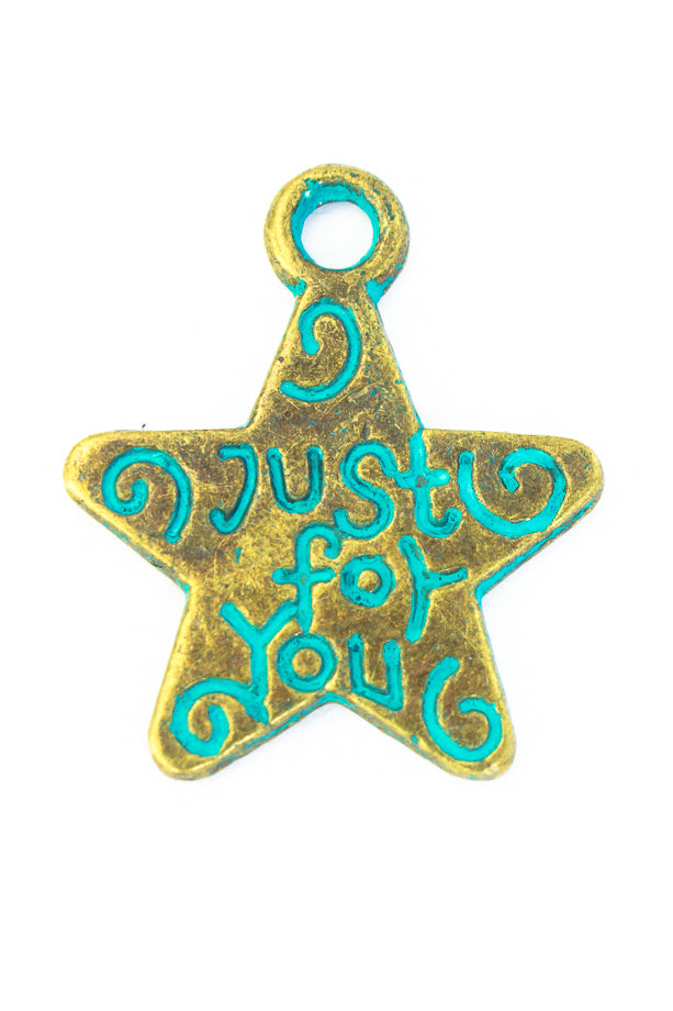 15mm five point star embossed "Just for You". 4mm loop with 3mm inner diameter.
