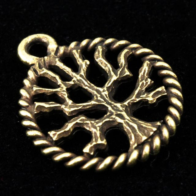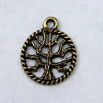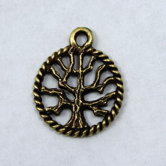 Detailed tree of life in circle with antique brass color plating and loop at top.