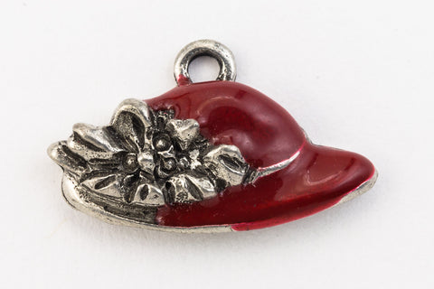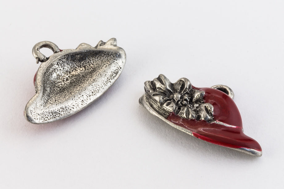 18mm x 10mm pewter hat with red enamel and 2mm loop at top.