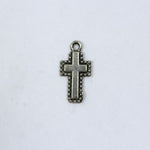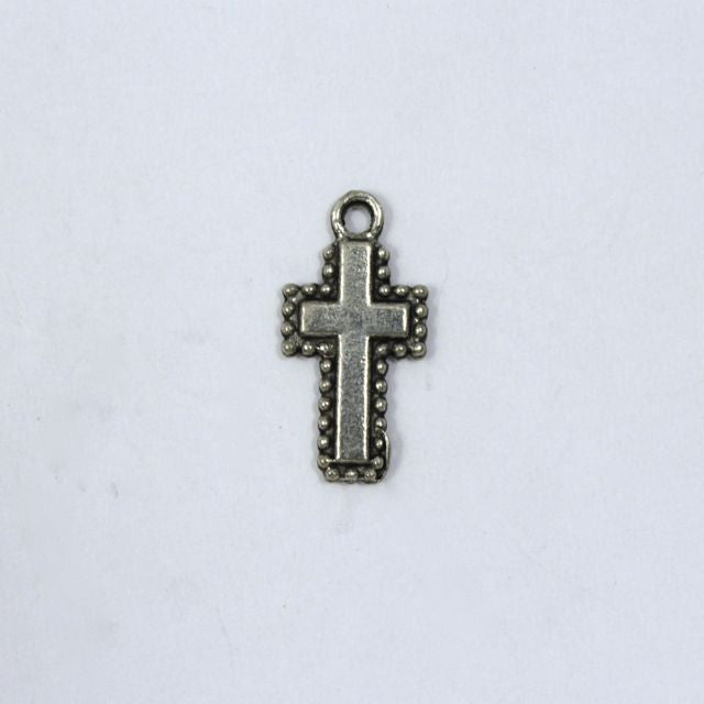 10mm x 20mm antique silver tone pewter cross with beaded border and loop at top.