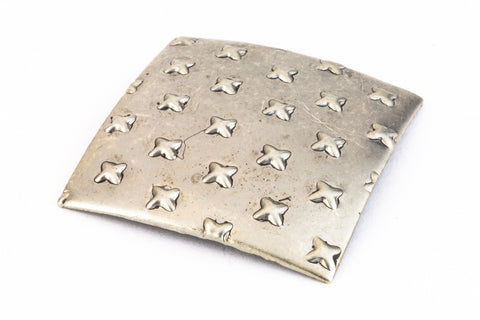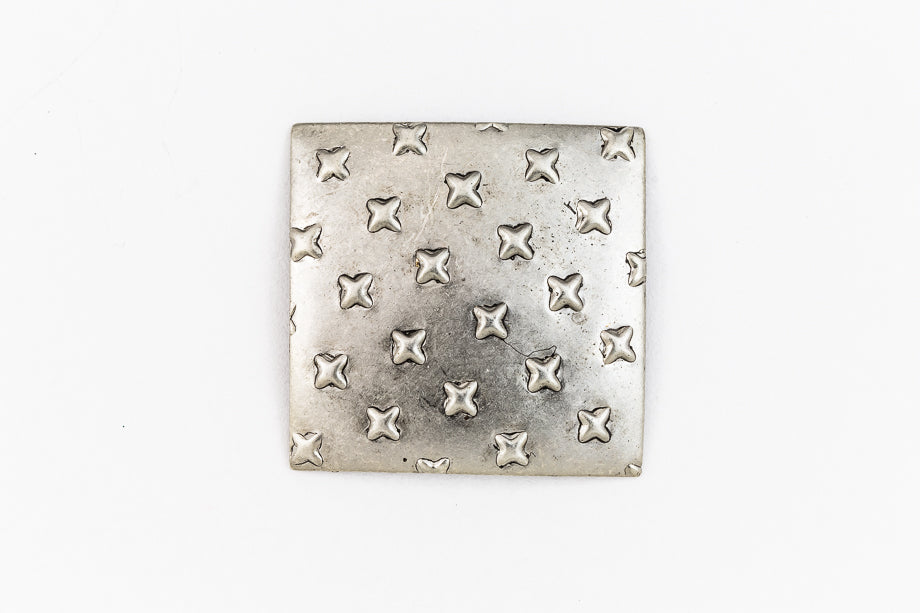 25mm antique silver lightly domed square with raised equal sided crosses.