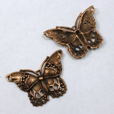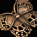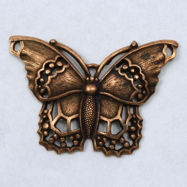 Detailed lacy butterfly with antique copper color plating and holes at each wingtip.