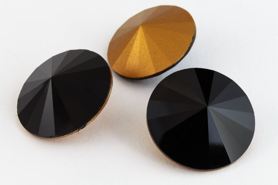 Swarovski article 1122 rivoli.Brilliantly faceted round fancy stone with point on front and back.Jet with gold foil.Made in Austria.