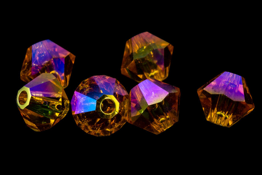 Transparent topaz faceted bicone with doubled aurora borealis coating.