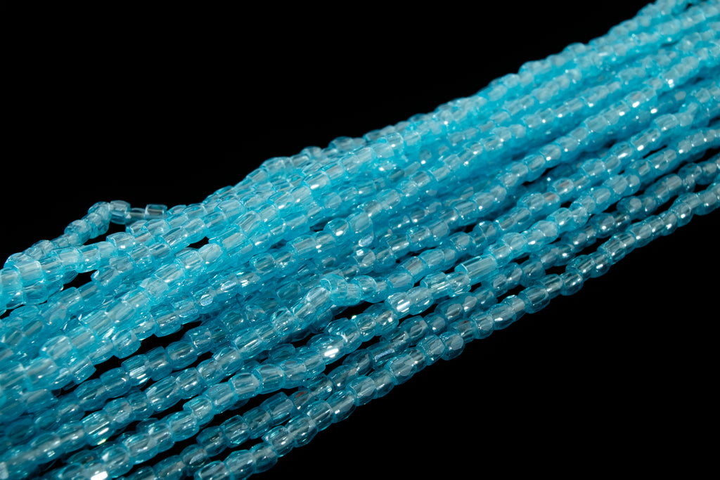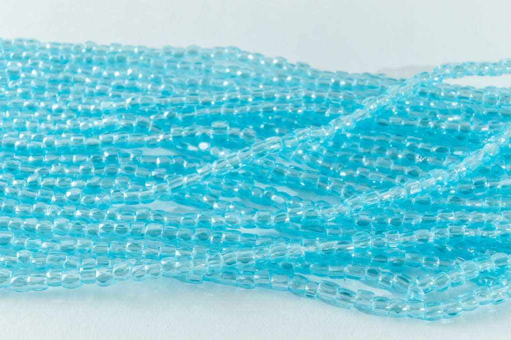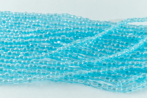 Size 12/0 (1.7mm) 3-cut glass seed bead in luster transparent ice blue.