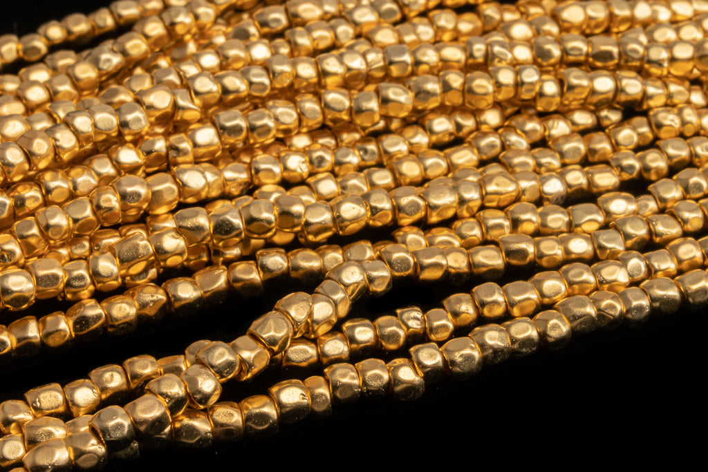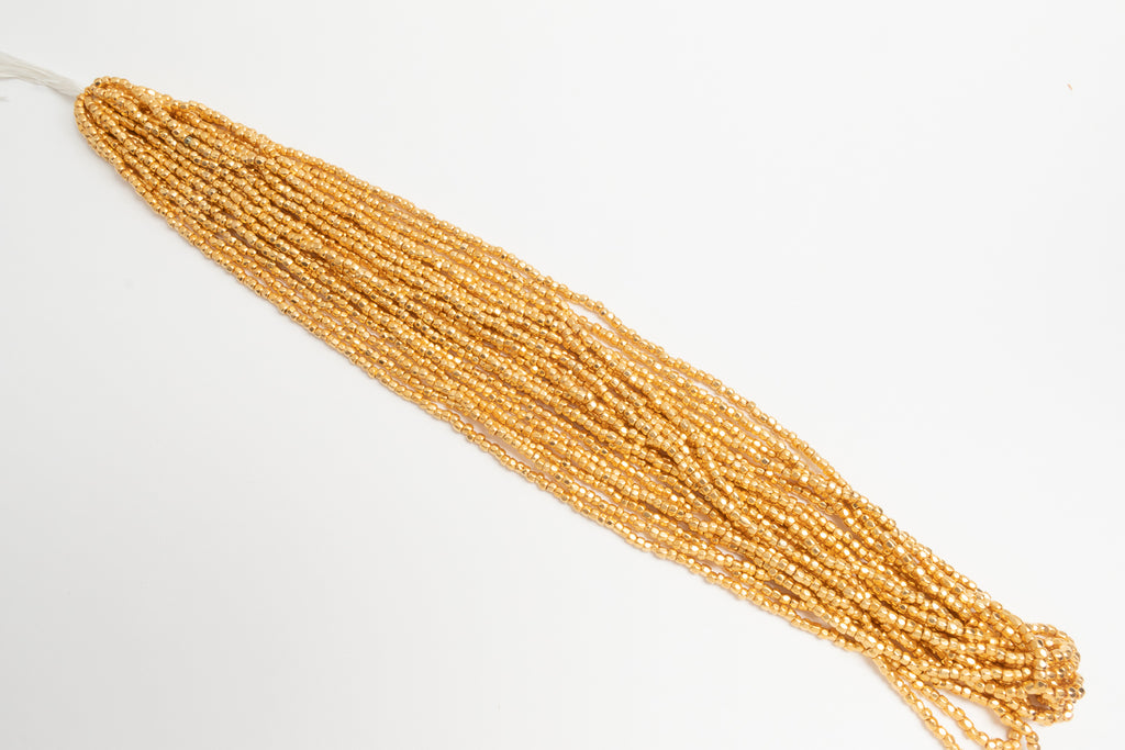 Size 9/0 (2.6mm) 3-cut glass seed bead plated in 24 karat gold.