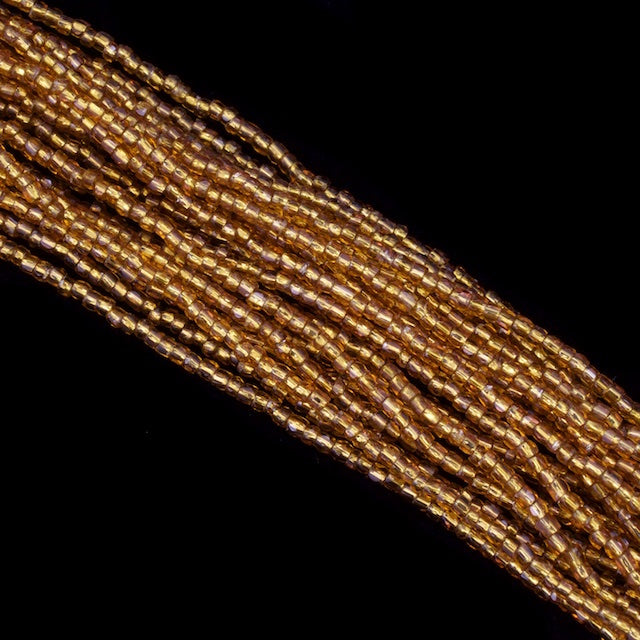Size 9/0 (2.6mm) 3-cut glass seed bead in silver lined topaz.