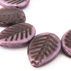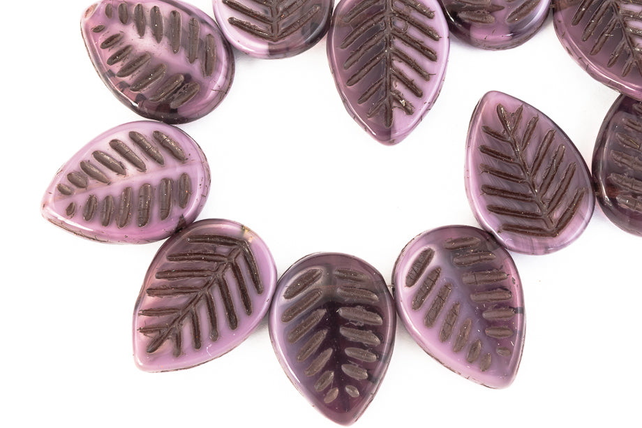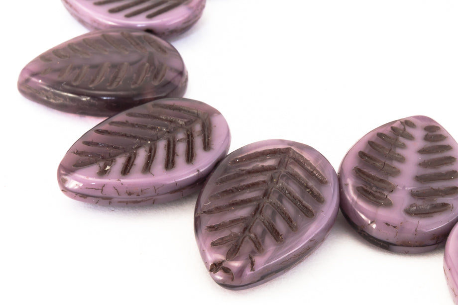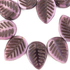 12mm by 16mm leaf shaped bead in transparent and opaque purple with brown wash.