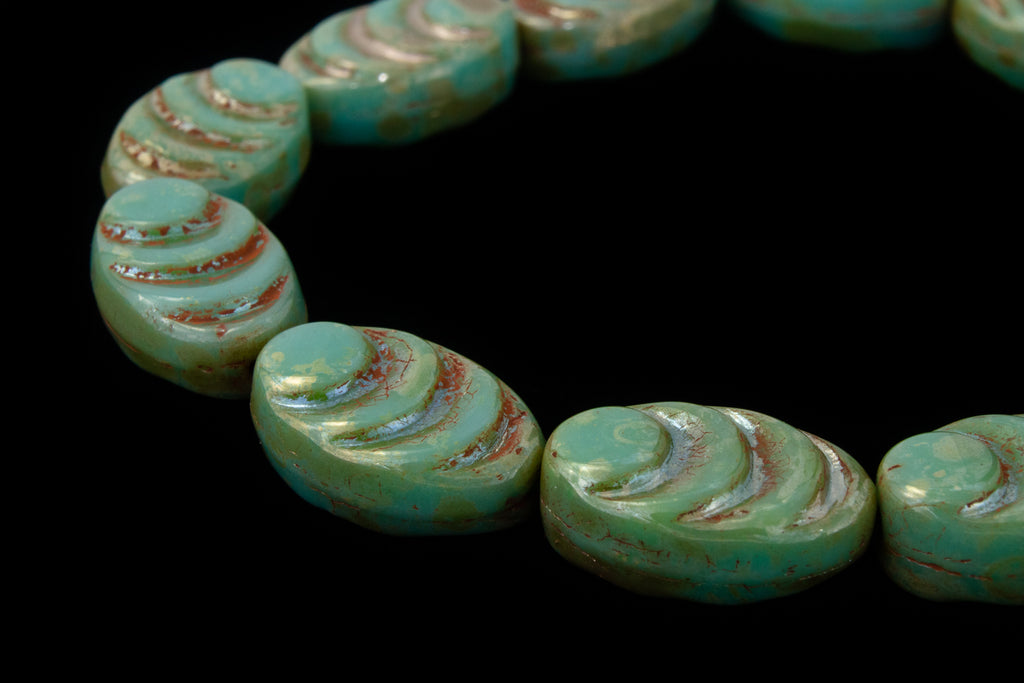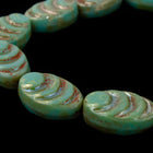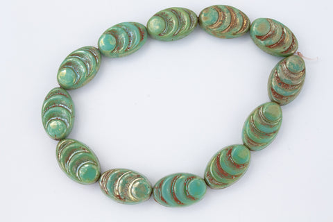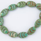 13mm x 8mm pale fern green cocoon shaped bead with Picasso finish.