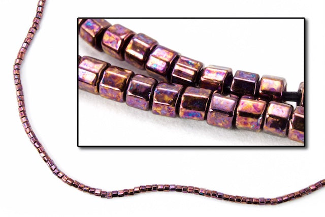 Size 10/0 metallic raspberry hex cut cylinder seed bead.