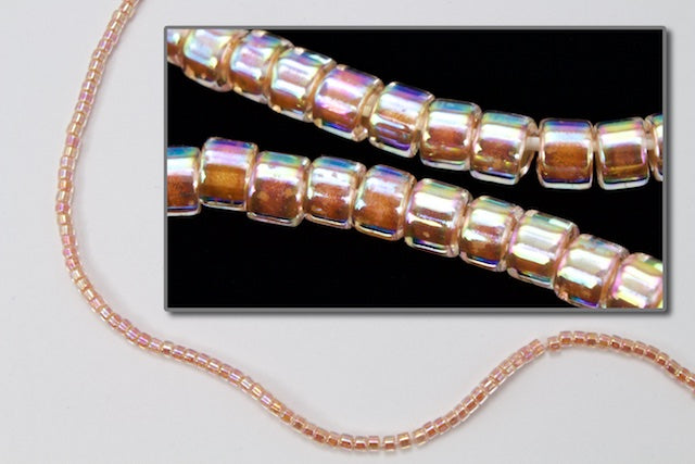 Size 10/0 peach lined iridescent crystal cylinder seed bead.