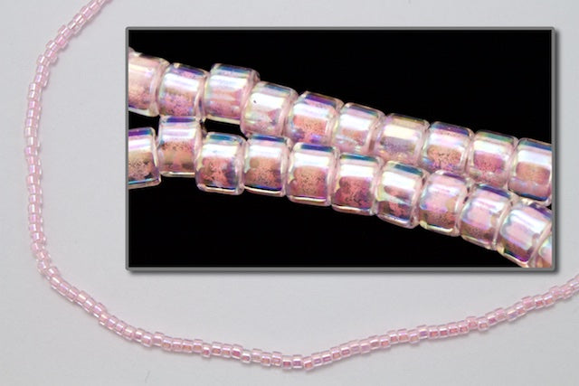 Size 10/0 pale pink lined iridescent crystal cylinder seed bead.