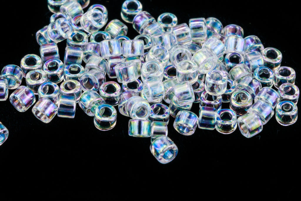 Size 10/0 light aqua lined iridescent crystal cylinder seed bead.