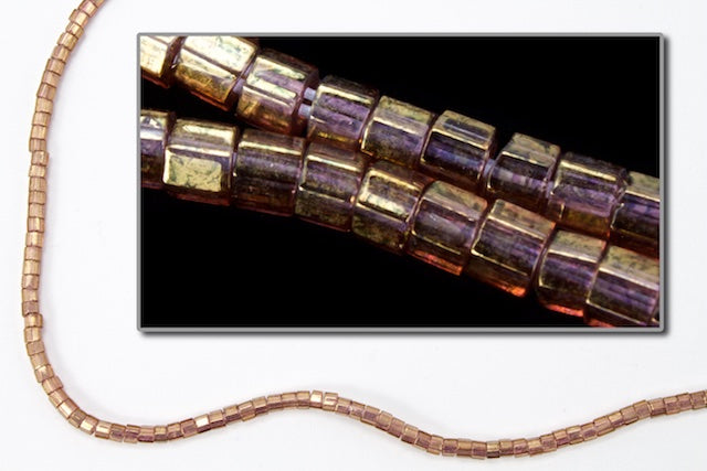 Size 11/0 transparent luster metallic rose gold hex cut cylinder seed bead.