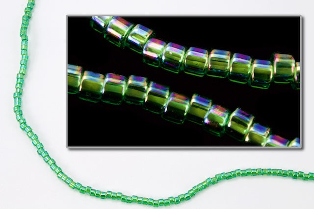 Size 10/0 transparent iridescent green cylinder seed bead.
