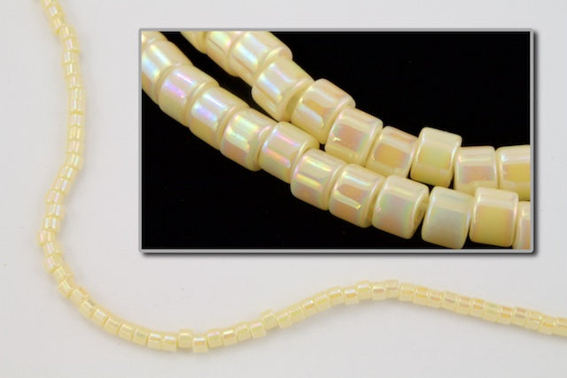 Size 10/0 opaque iridescent cream cylinder seed bead.