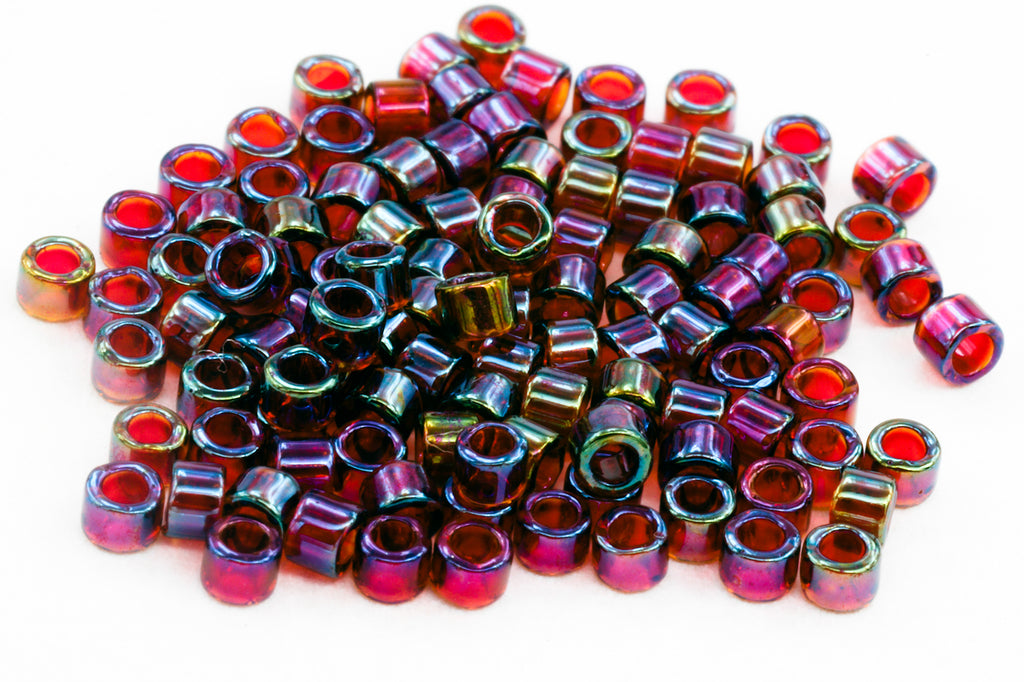 Size 11/0 red lined iridescent topaz cylinder seed bead.