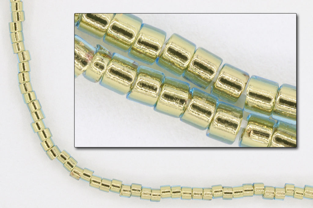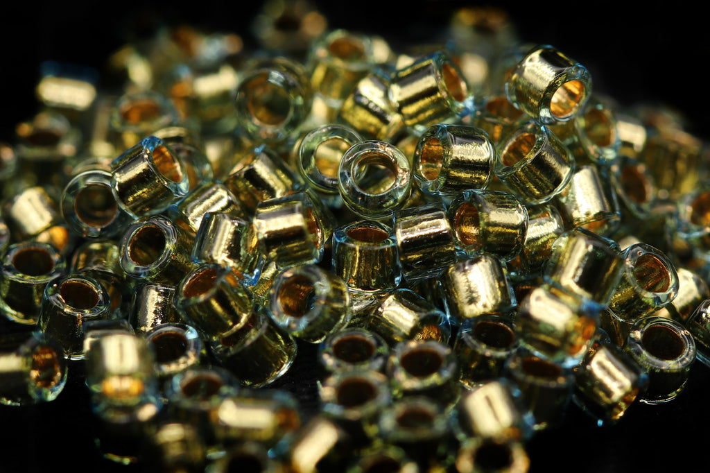 Size 11/0 24 karat gold lined light aqua cylinder seed bead.