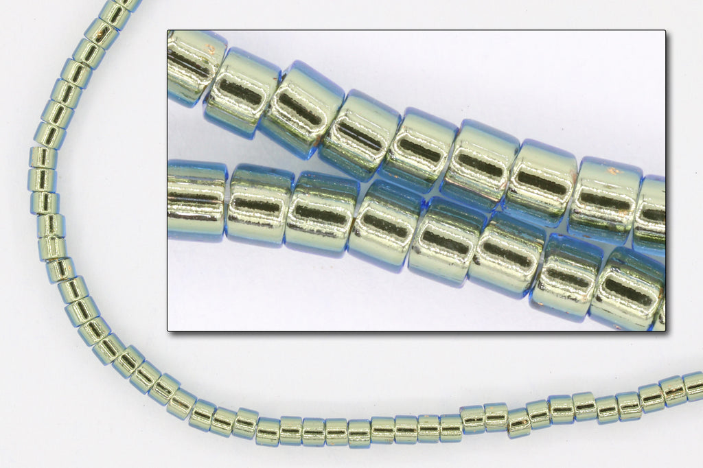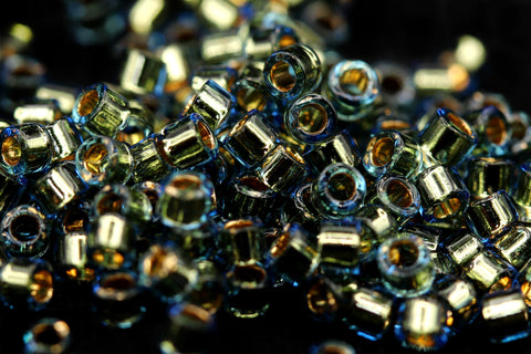 Size 11/0 24 karat gold lined light blue cylinder seed bead.