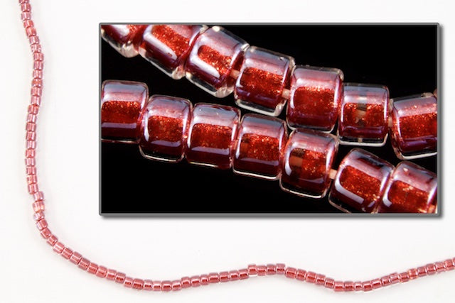 Size 10/0 shimmering cranberry lined crystal cylinder seed bead.