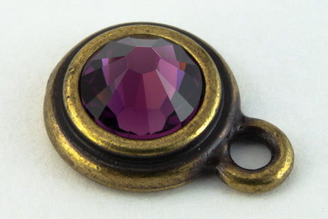 16mm x 12mm antique brass round ear post with bezel filled by 34ss amethyst flat back rhinestone. Inner diameter measures 7.2mm. 2.25mm loop.