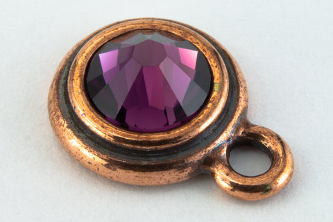16mm x 12mm antique copper round ear post with bezel filled by 34ss amethyst flat back rhinestone. Inner diameter measures 7.2mm. 2.25mm loop.