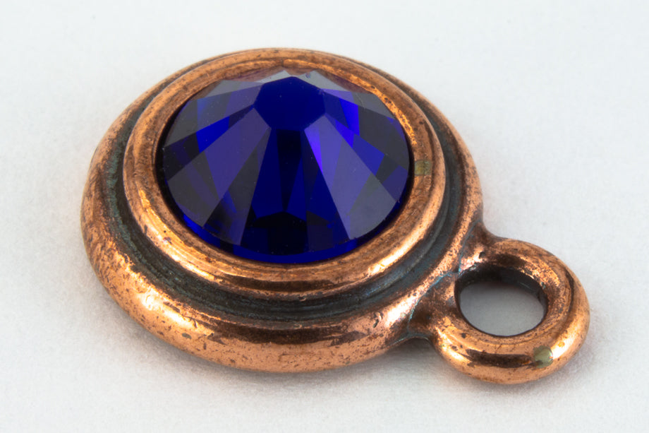 16mm x 12mm antique copper round ear post with bezel filled by 34ss cobalt flat back rhinestone. Inner diameter measures 7.2mm. 2.25mm loop.