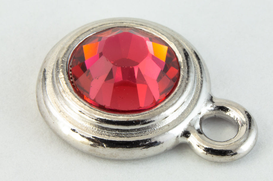 16mm x 12mm rhodium round ear post with bezel filled by 34ss Indian Pink flat back rhinestone. Inner diameter measures 7.2mm. 2.25mm loop.