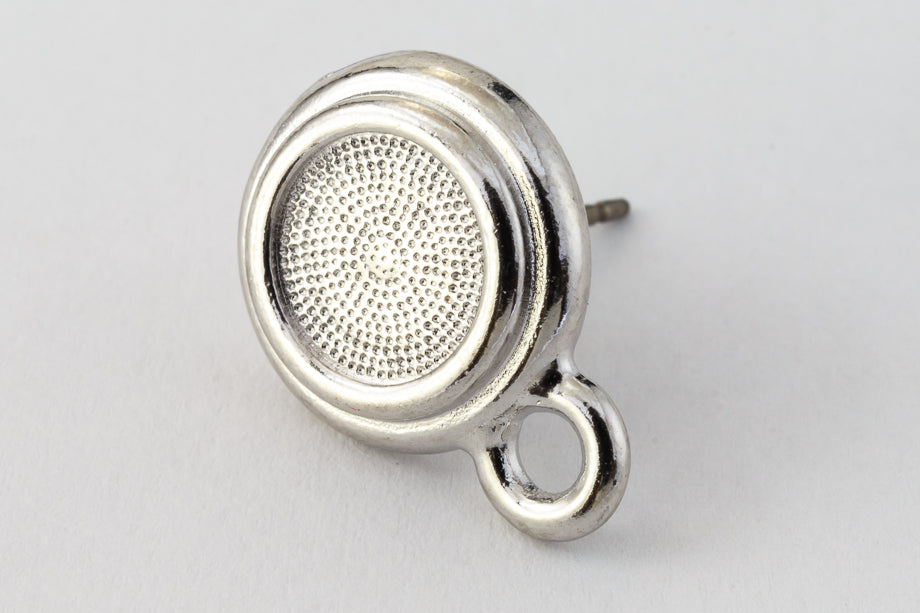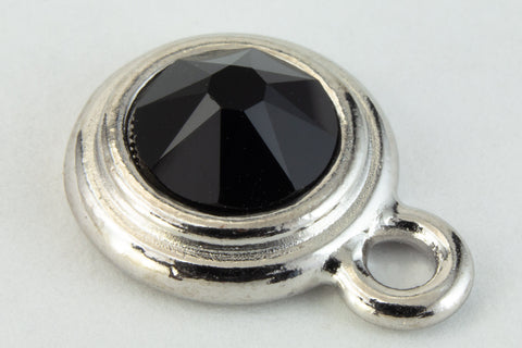 16mm x 12mm rhodium round ear post with bezel filled by 34ss jet flat back rhinestone. Inner diameter measures 7.2mm. 2.25mm loop.
