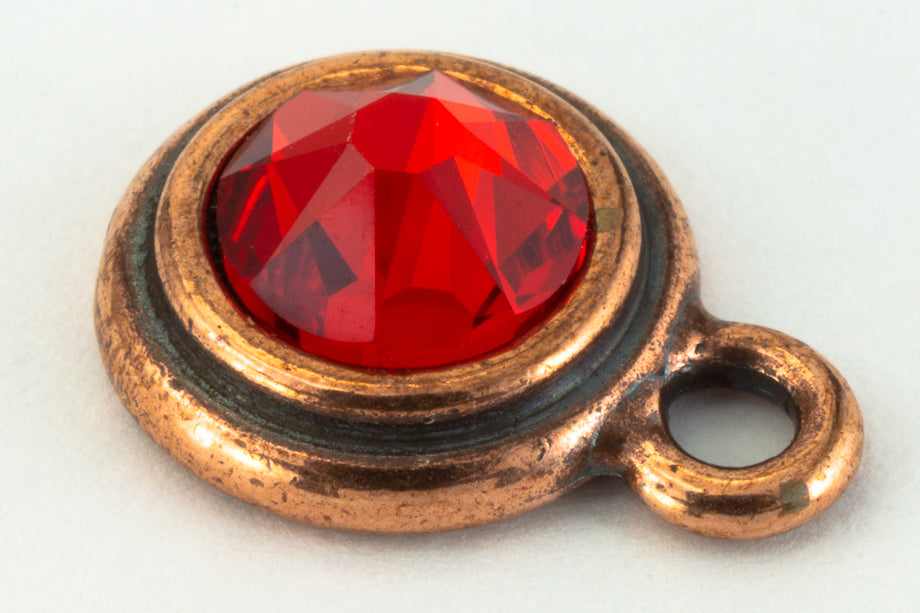 16mm x 12mm antique copper round ear post with bezel filled by 34ss light siam flat back rhinestone. Inner diameter measures 7.2mm. 2.25mm loop.