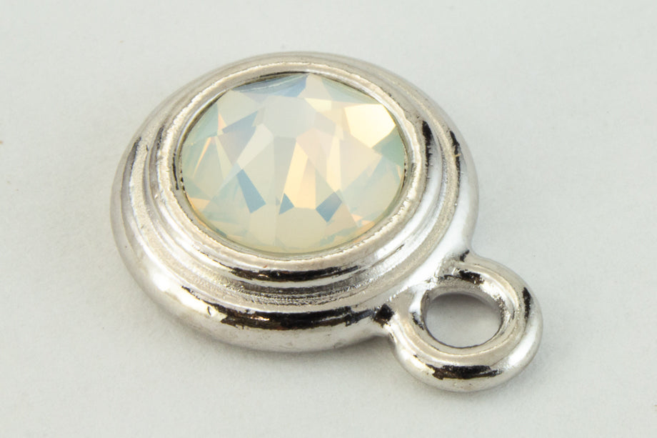 16mm x 12mm rhodium round ear post with bezel filled by 34ss white opal flat back rhinestone. Inner diameter measures 7.2mm. 2.25mm loop.