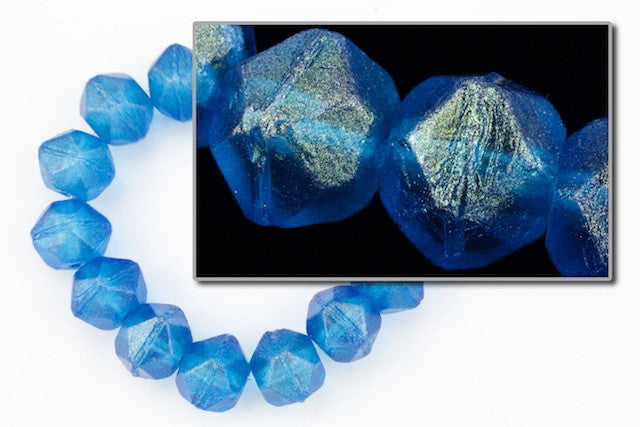 10mm transparent Capri blue "English cut" glass faceted bead with gold luster finish.