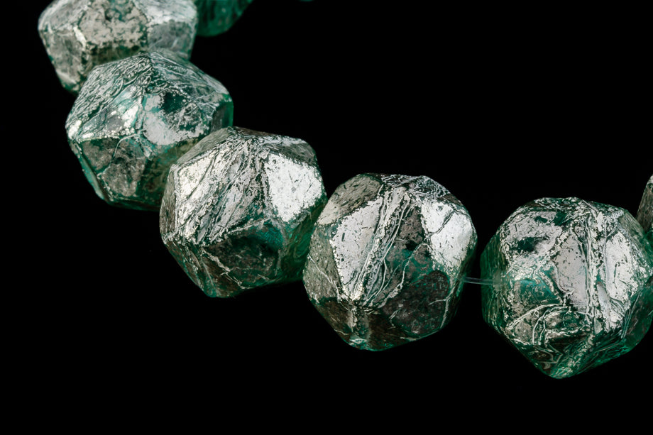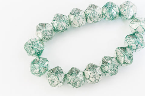 10mm transparent green aqua "English cut" glass faceted bead with mercury finish.