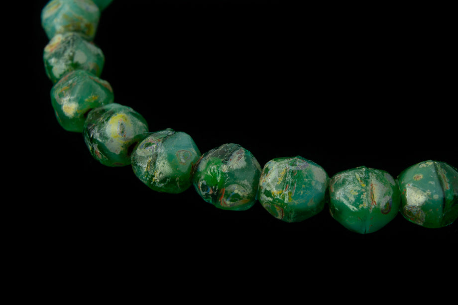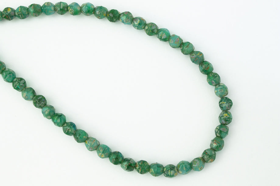 4mm transparent and opaque green turquoise "English cut" glass faceted bead with Picasso finish.