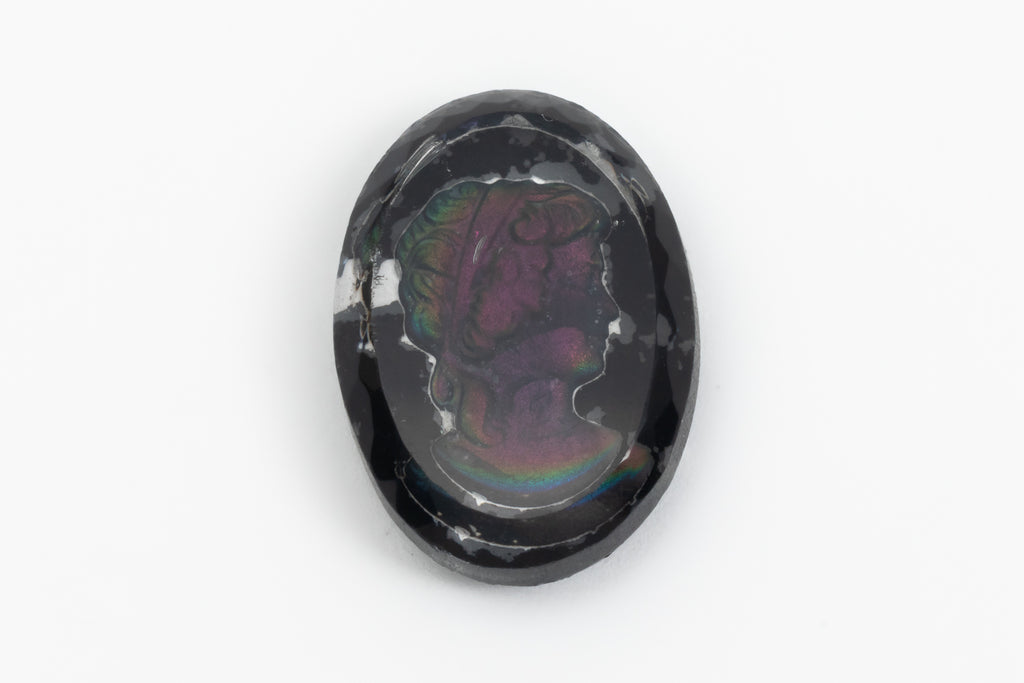 12.61mm x 17.60mm oval flat back with right facing intaglio profile of a woman with Regency or Hellenistic hairstyle.