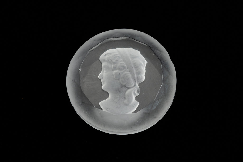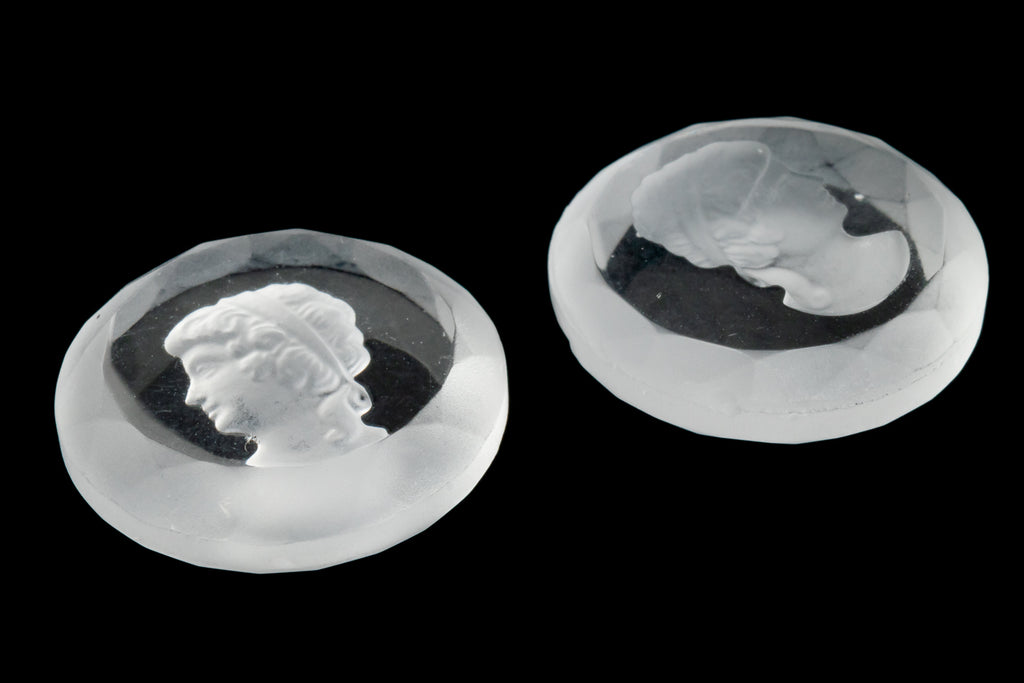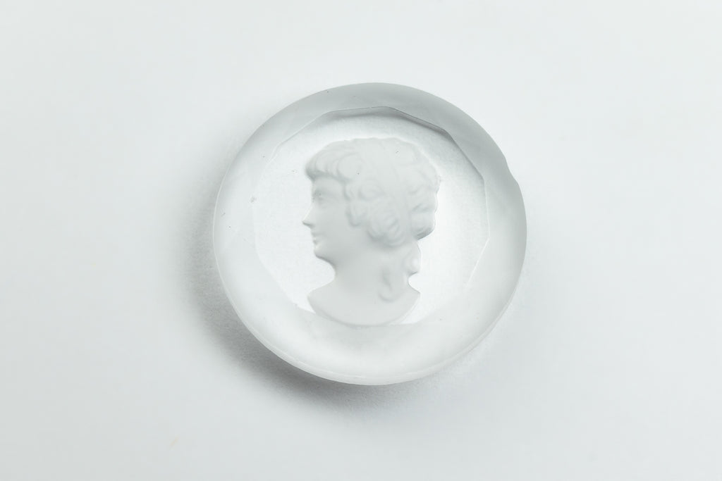 18mm round flat back with left facing intaglio profile of a woman with Regency or Hellenistic hairstyle. Outer edge has triangular facets.