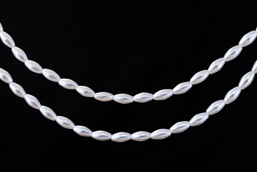 60" strand of 4mm x 8mm white luster plastic pearl rice beads.