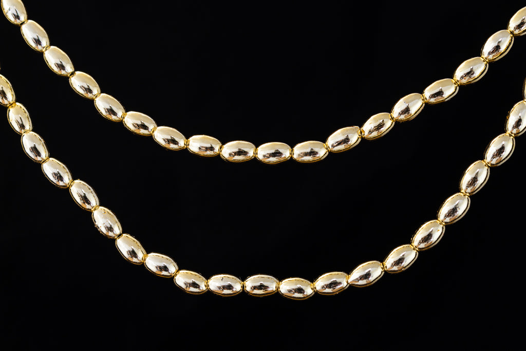 60" strand of 5mm x 7mm metallic gold oval plastic pearl beads.