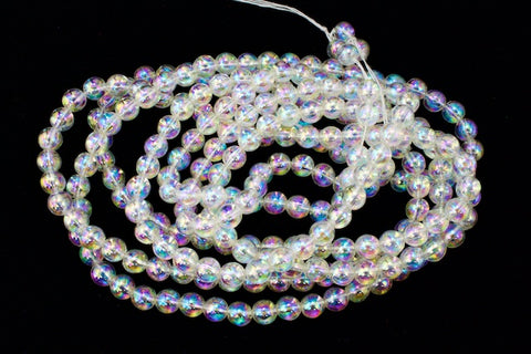 60" strand of 8mm crystal clear round plastic pearls with iridescent sheen.